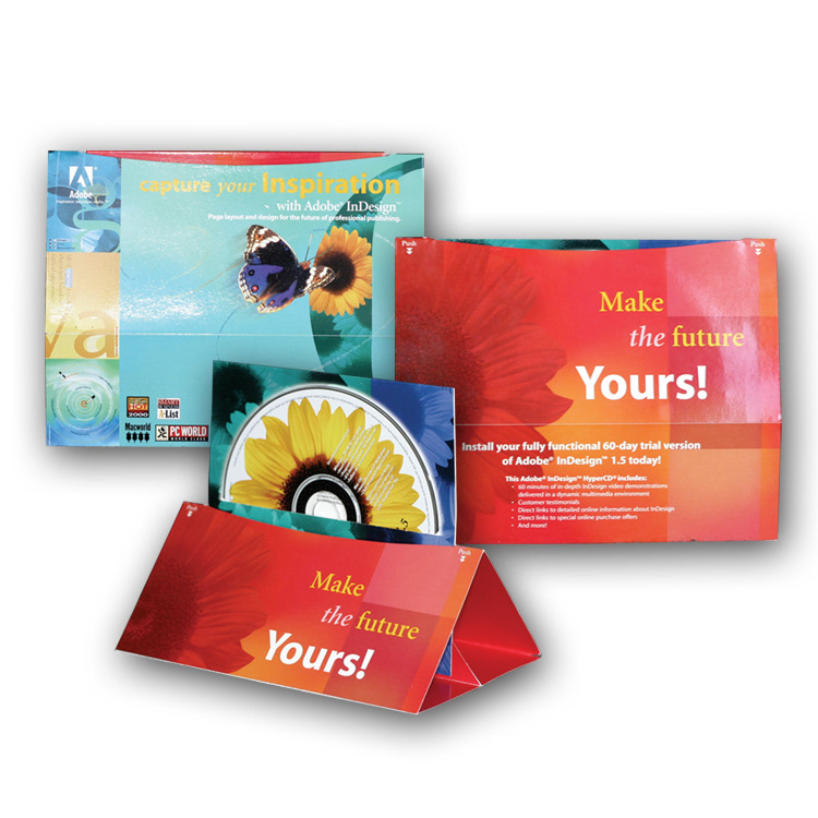 Direct-mail design for Adobe targeting creative professionals. The printed piece included a CD loaded with InDesign for a free trial-period.