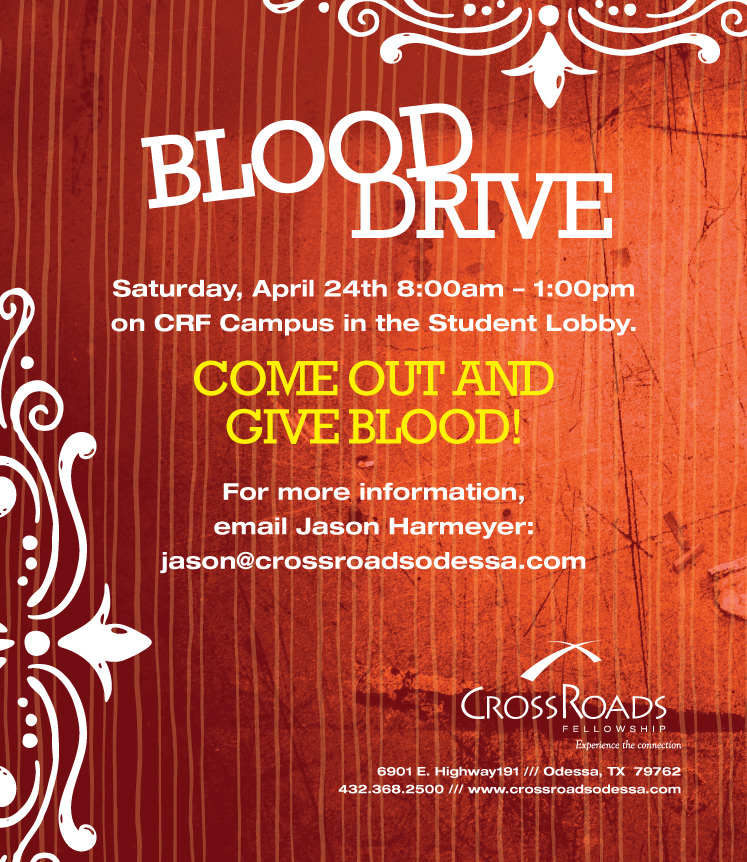 Design, layout, and concept for a blood drive event at Crossroads Fellowship.