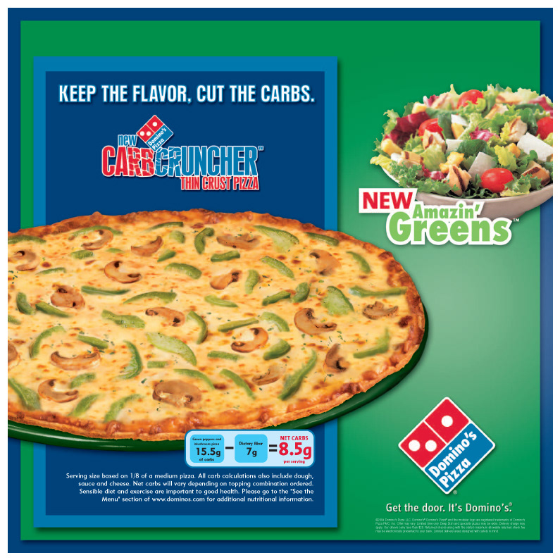 Design and layout for a Domino's Pizza FSI CarbCruncher promotion.