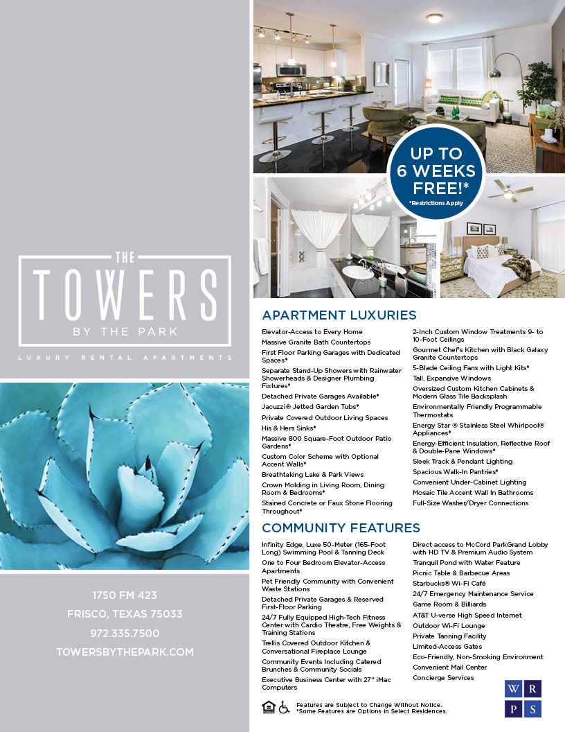 Design, layout, and concept for an apartment complex in Dallas called The Towers by the Park.